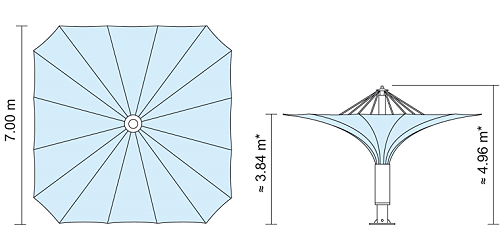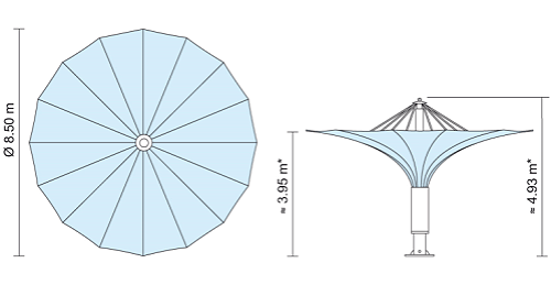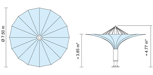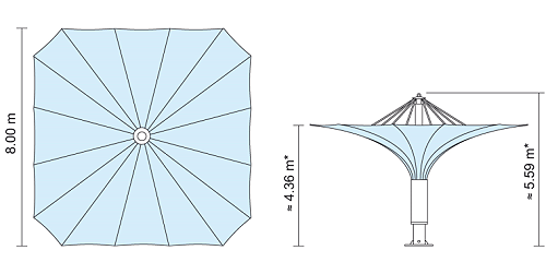 На випадок сильних дощів передбачена вбудована водостічна система у вигляді спеціальних каналів, що проходять усередині колони парасолі. На вибір, є 2 типи систем: відведення зливових вод або що просочується (відповідно наземні або підземні дренажні канали). Завдяки вбудованій системі з двома приводами, парасоля легко відкривається та закривається.